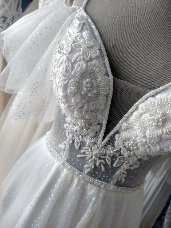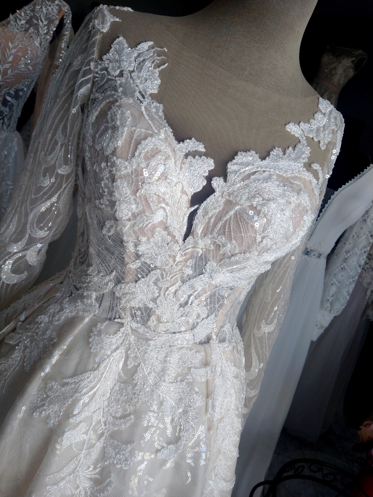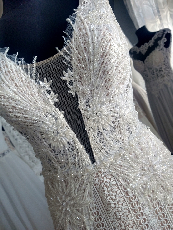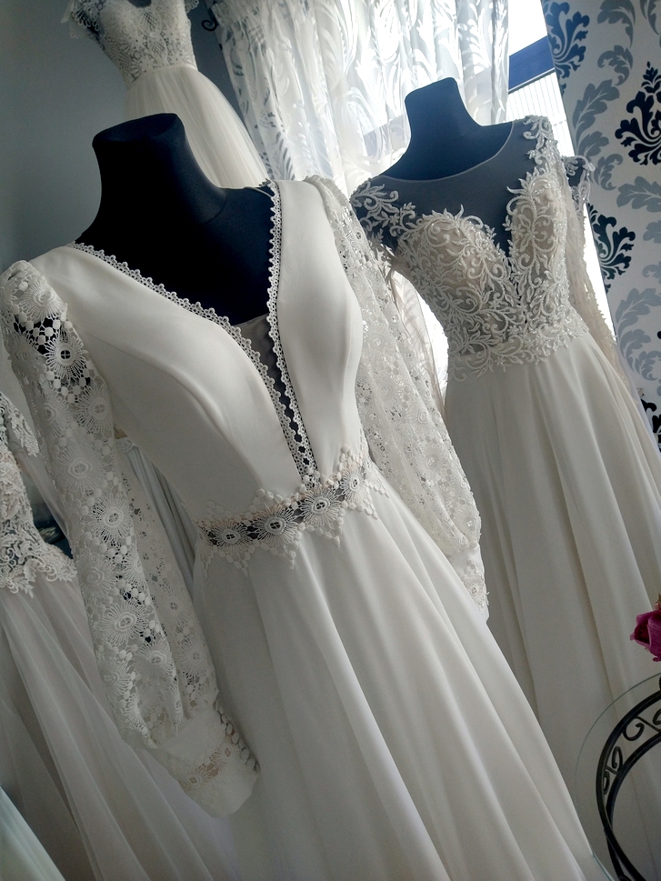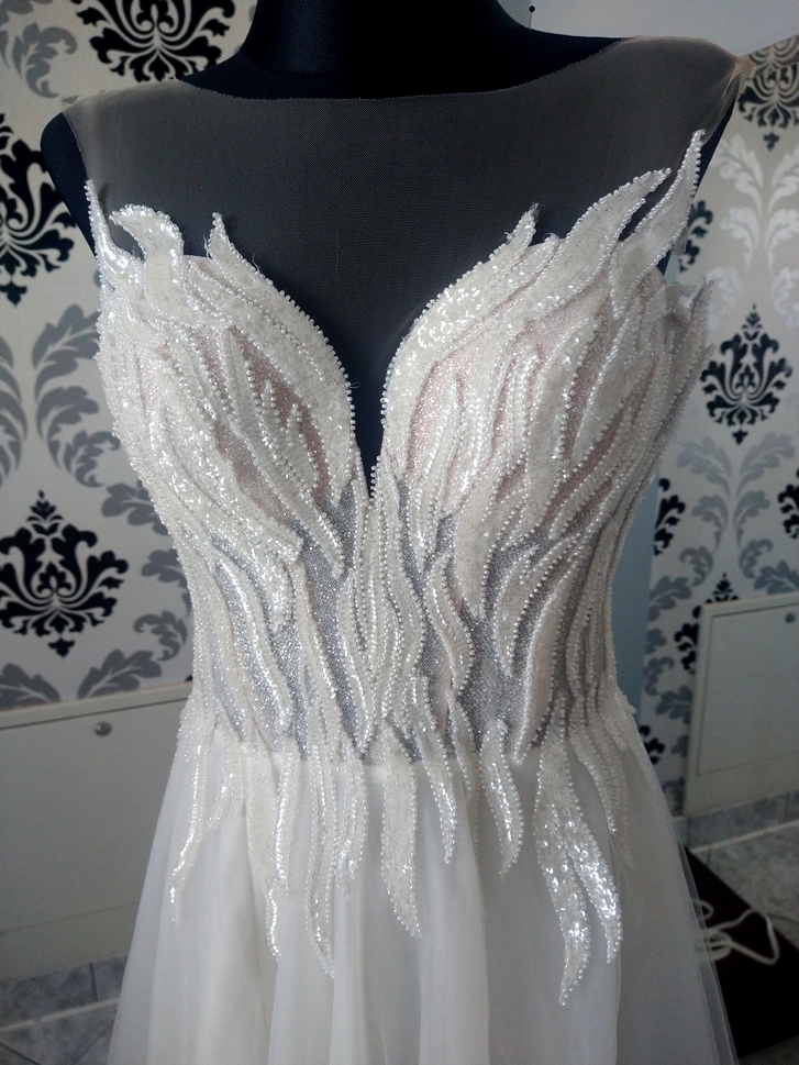 Klientka sama sobie może zaprojektować suknię, opierając się na zdjęciach, katalogach czy wydrukach z internetu. Istnieje możliwość wybrania dodatków, aplikacji, koronek. Suknia szyta jest na sylwetkę Klienta.