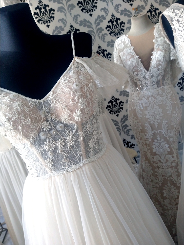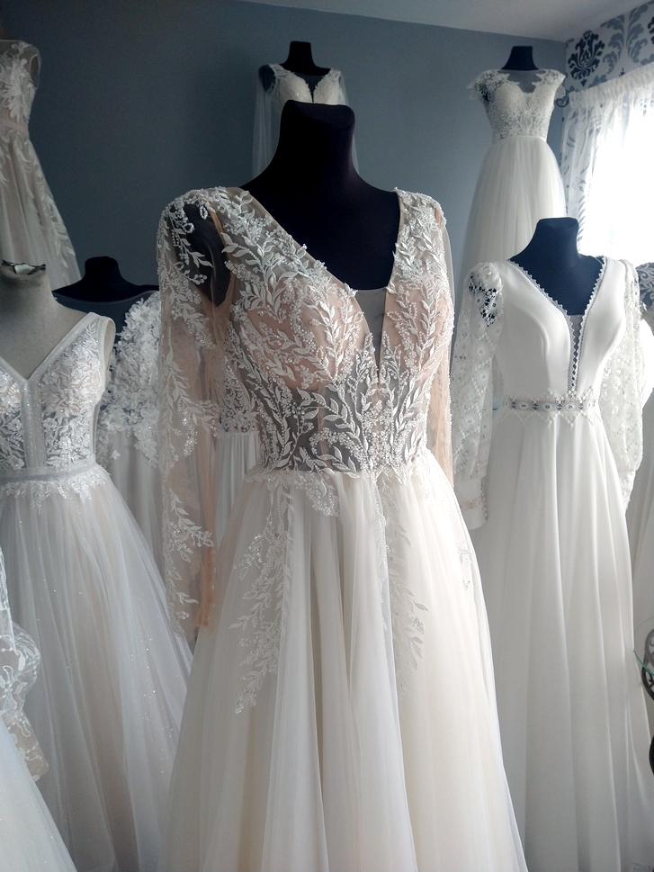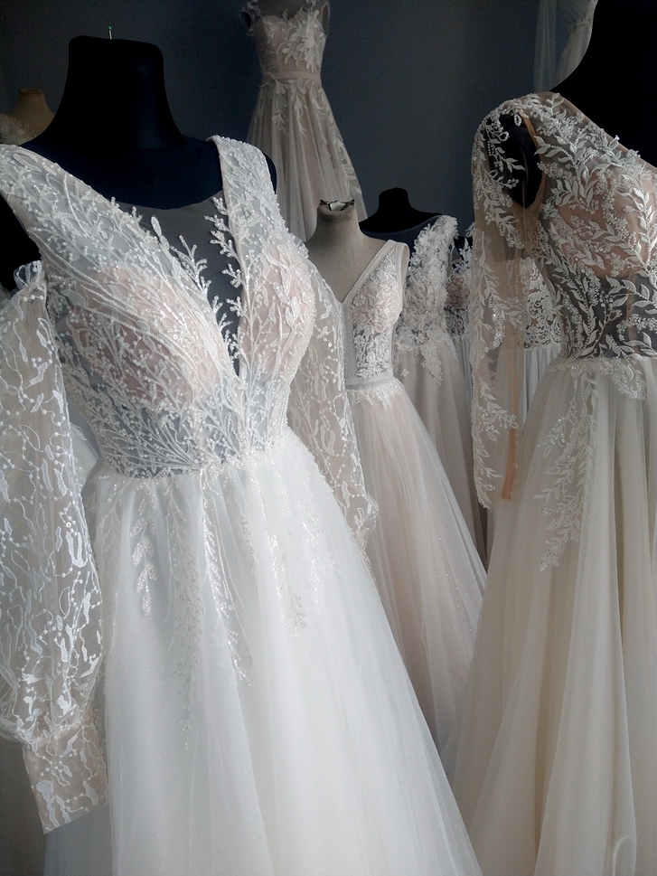 Oferujemy suknie w kolorze białym i ecru odpowiadających najnowszym trendom mody.